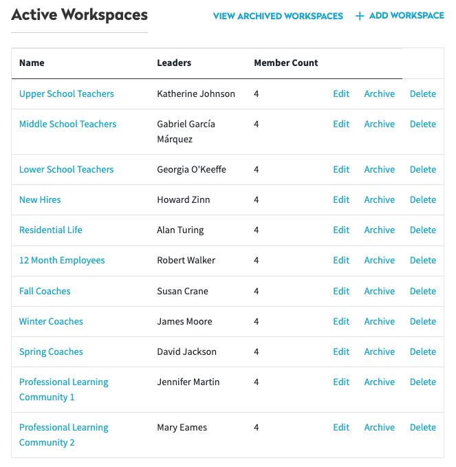 To archive or delete a Workspace, click the Archive or Delete link associated with the Workspace. You will receive a confirmation pop-up before the action is completed.